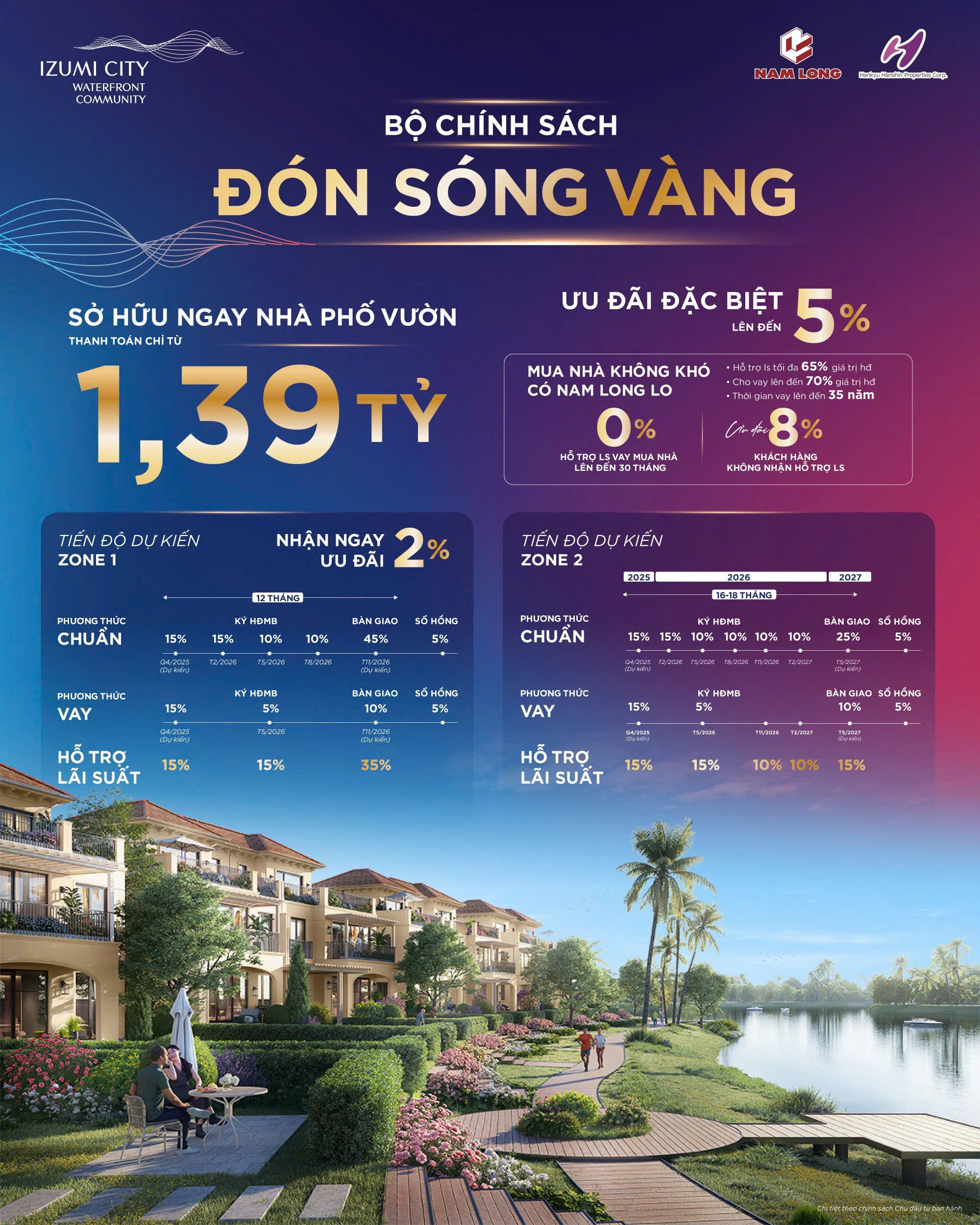 Khu đô thị đa tiện tích bao gồm: – Căn hộ Flora Izumi – Nhà phố liền kề – Biệt thự song lập – Biệt thự đơn lập – Shophouse Izumi – Grand Villa Izumi – Dinh thự Izum City